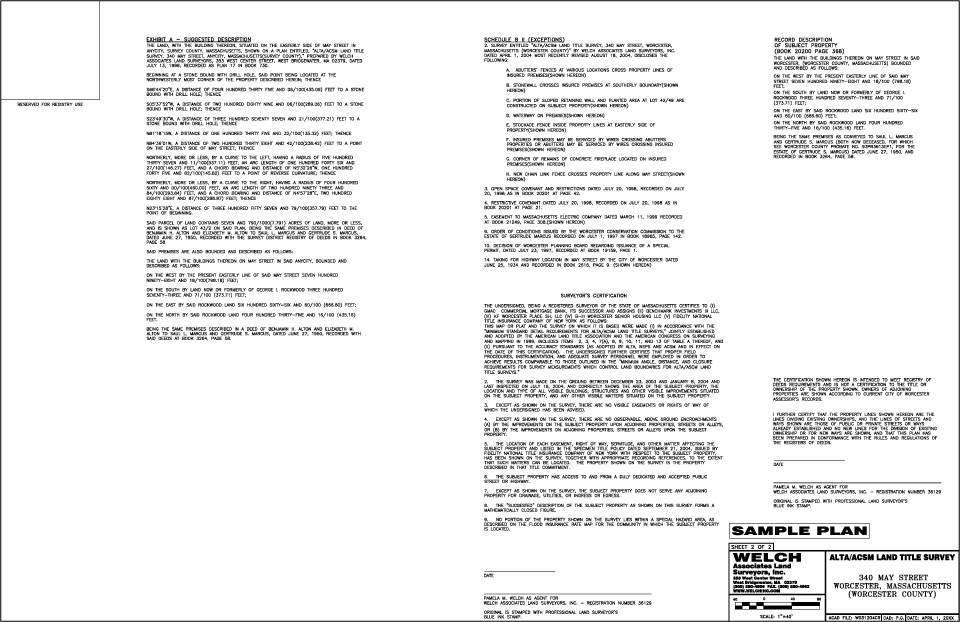 ALTA / ACSM SURVEYSThe American Land Title Association and the American Congress on Surveying and Mapping have implemented standards for surveyors to follow when performing ALTA/ACSM Land Title Surveys. These are strict guidelines (click link below to view) that must be followed before a surveyor certifies the plan. This type of survey is required by lenders for major property transfers or refinancing. Welch has performed numerous ALTA/ACSM Land Title Surveys since its inception in 1993. CLICK THE IMAGES BELOW TO VIEW SAMPLE PLANS